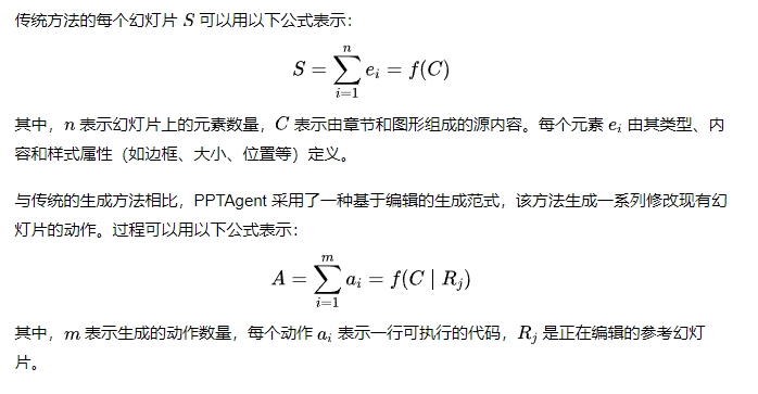 来看一个PPT生成思路:PPTAgent。传统的PPT生成方法通常使用端到端的文本生成范式,这种方法仅关注文本内容,忽略了布局设计和PPT结构。PPTAgent 采用了一种基于编辑的生成范式,解决处理空间关系和设计风格方面的挑战。