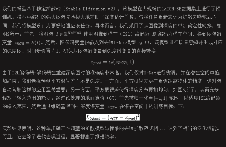 近年来,零-shot单目深度估计主要发展为两大类方法:基于数据的方法和基于模型的方法。基于数据的方法:依赖于大量的图像-深度对,通过训练得到图像与深度之间的映射。然而,这一过程非常耗时且需要巨大的计算资源。与之相对,基于模型的方法则通过利用预训练的骨干网络,尤其是在稳定扩散模型(Stable Diffusion)上下文中,展现了较为高效的性能。例如,Marigold通过将深度估计重构为扩散去噪过程,在泛化和细节保留方面取得了令人印象深刻的成果。然而,迭代去噪过程导致了较低的推理速度。