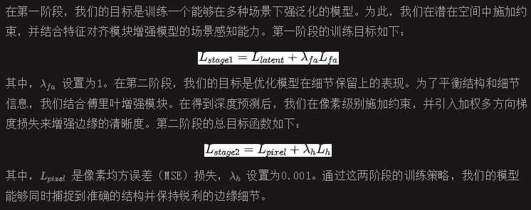 由于I2L编码器-解码器的深度重建精度已经足够高,我们将重点微调U-Net。实验表明,潜在空间的监督有助于模型更好地捕捉全局场景结构,而像素级的监督则有助于捕捉细粒度的细节,但也会引入全局结构的失真。基于这些观察,我们提出了一个两阶段的训练策略。