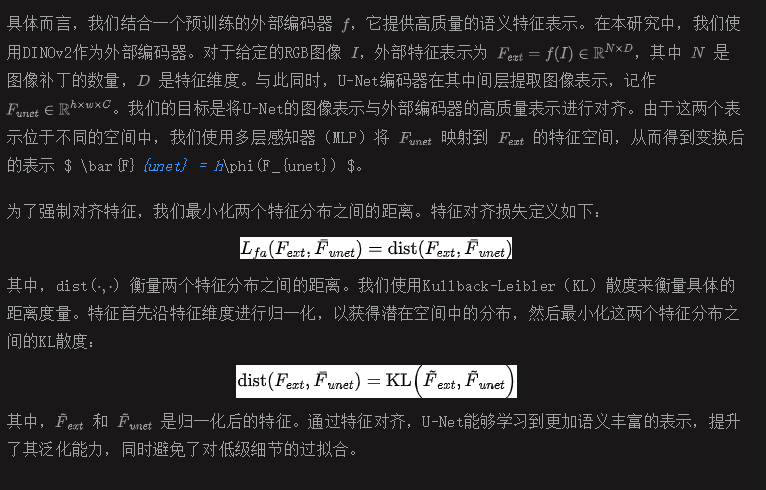 稳定扩散v2由两个主要组件组成:I2L编码器-解码器和去噪U-Net。I2L编码器-解码器负责特征压缩,旨在减少推理时间和训练成本。通过图像重建训练,它主要捕捉低层特征。与此不同,U-Net负责从噪声图像中恢复图像,从而使其具备场景感知与推理能力。然而,由于U-Net是通过重建任务进行训练的,它往往过度强调细节纹理,从而导致深度预测中的伪纹理问题(如图1所示)。因此,我们引入语义正则化来增强U-Net的场景表示能力,并防止过度拟合低级的颜色信息。