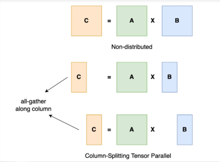 为了更好地理解张量并行,顾名思义,我们沿着特定的维度将张量分割几块,这样每个设备只容纳张量的1/N块。使用这个部分块执行计算以获得部分输出。这些部分输出从所有设备收集而来,然后组合。