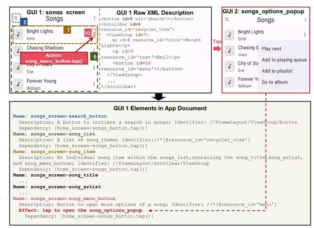 该模型在离线阶段会构建应用程序文档,包含 AI 引导的 GUI 状态压缩、元素 XPath 自动生成和 GUI 依赖分析,为脚本生成奠定基础。