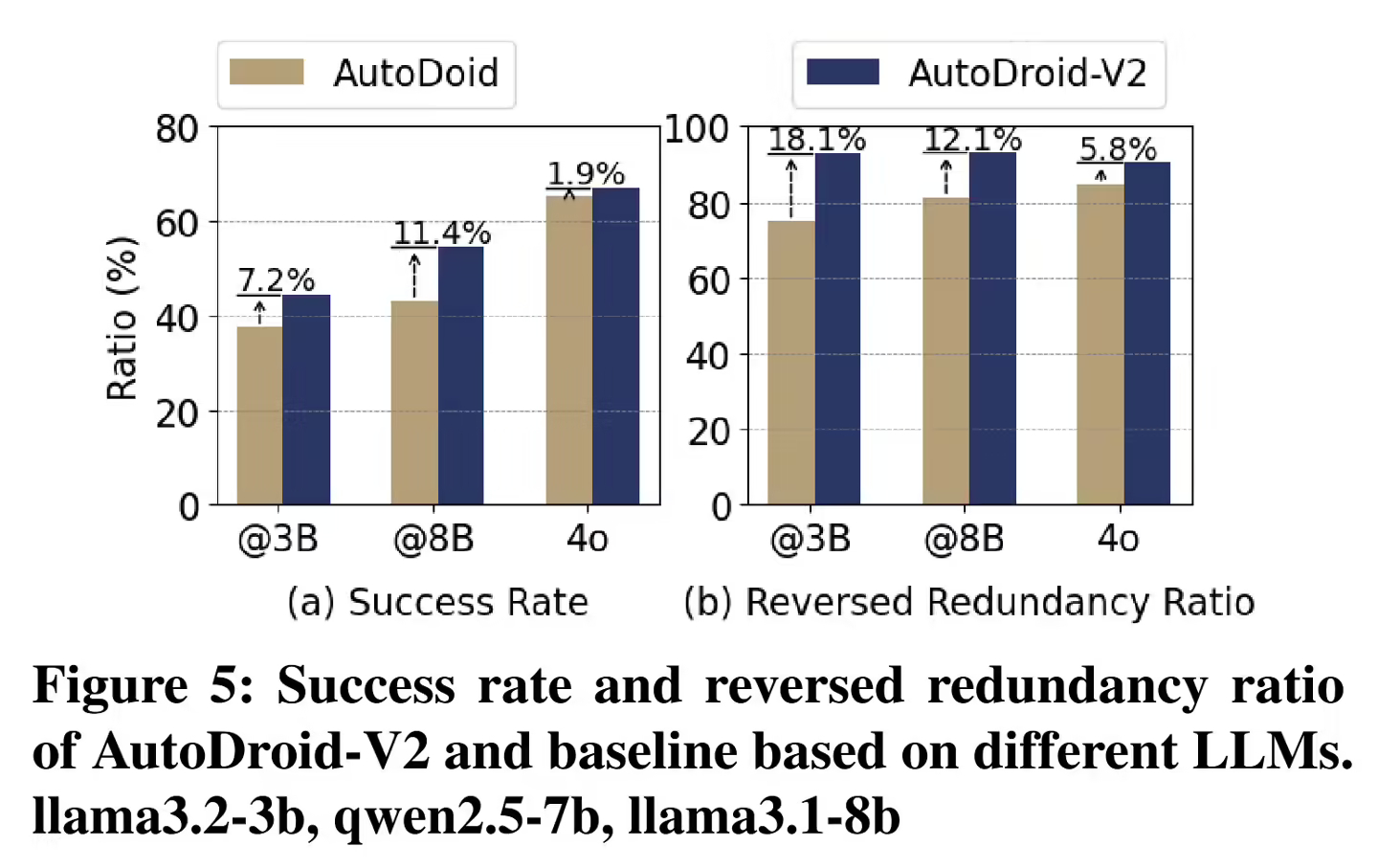 跨 LLM 测试中,在 Llama3.2-3B、Qwen2.5-7B 和 Llama3.1-8B 上表现一致,成功率 44.6%-54.4%,反向冗余比 90.5%-93.0%。