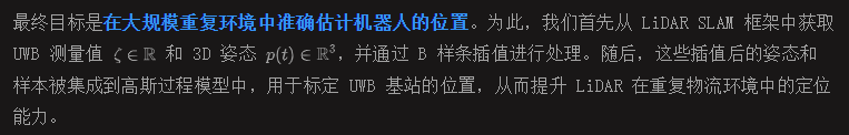 通过高斯过程标定 UWB 基站位置,可以实现更高的精度和鲁棒性。相比传统方法,该方法能够更好地应对复杂和非视距 (NLoS) 环境中的基站标定问题,从而显著提升整体定位性能。