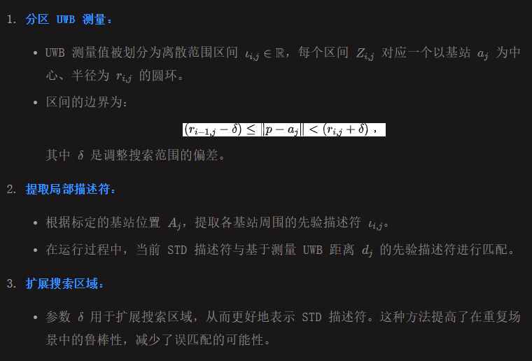 STD 仅依赖三角形描述符来识别场景,但在重复场景中容易出错。通过将 STD 与标定后的 UWB 数据结合,我们引入了基于范围的分区搜索来增强定位性能。