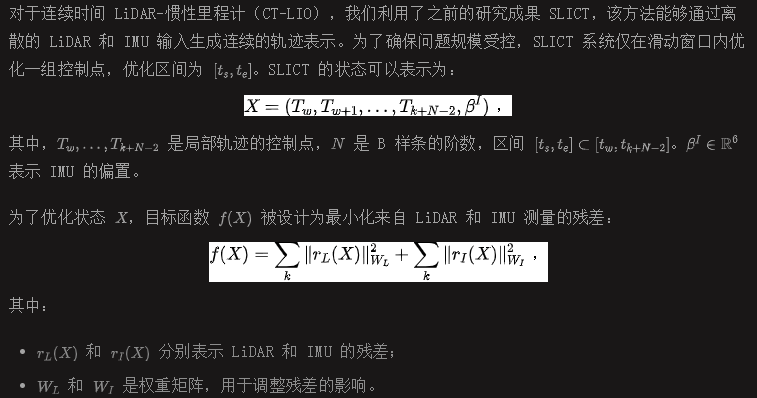 目标函数通过一个基于流形的优化求解器进行最小化,该求解器仅依赖于 Eigen 库,从而实现最高的计算效率。这种优化方法保证了在指定时间窗口内生成连续时间轨迹,同时处理传感器输入中的噪声和偏差问题。