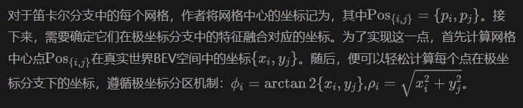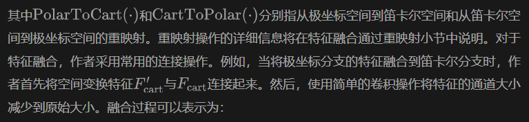 为了进一步加速模型推理,作者使用重映射操作对一个分支的特征与另一个分支对齐,这使模型能够仅对重映射分支执行一次网格采样。在论文中,作者选择将从极坐标分支提取的特征与笛卡尔空间对齐,因为作者实验发现这比相反的方式表现略好。作者将重映射的极坐标特征与笛卡尔特征连接,然后使用网格采样获得每个点的BEV位置特征。因此,作者方法中的最终点级特征输出可以表示为: