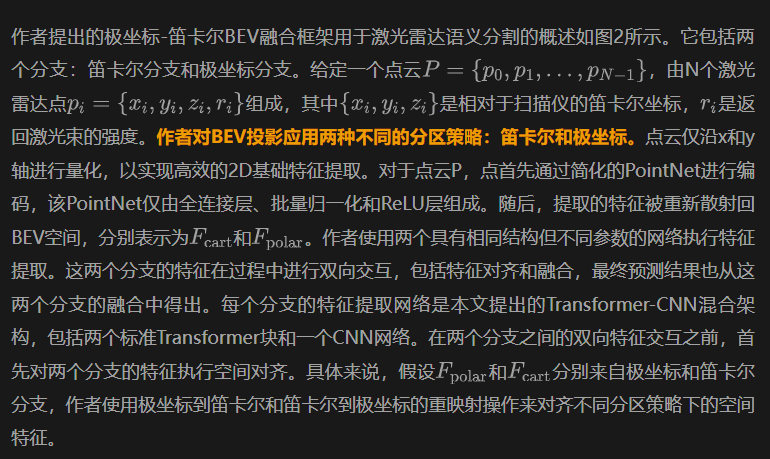 论⽂题目:PC-BEV: An Efficient Polar-Cartesian BEV Fusion Framework for LiDAR Semantic Segmentation