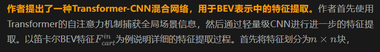 作者还提出了一种混合Transformer-CNN架构,用于BEV特征提取。Transformer块中的自注意力捕获全局场景信息,然后是一个轻量级的U-net样式CNN用于详细特征提取。实验结果表明,这种架构在保持实时推理能力的同时增强了模型性能。